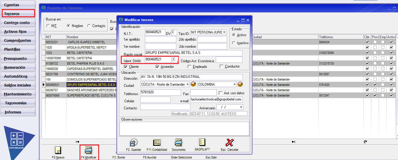 e debe acceder por el modulo de Contabilidad o modulo de Tesorería la ventana "Registro de Terceros" en la parte de Datos de Identificación DIAN, en el campo de DV DIAN se debe corregir el digito de verificación, si no esta seguro de cual es, puede validarlo en el siguiente link https://www.colconectada.com/digito-de-verificacion-dian/