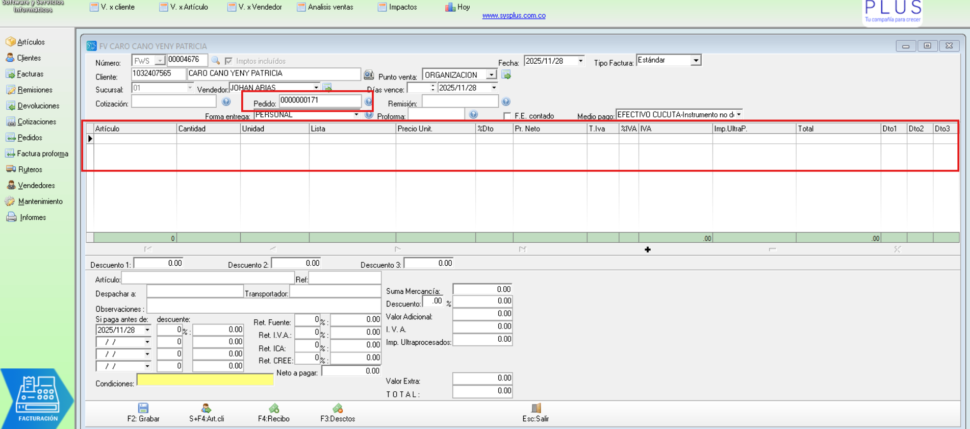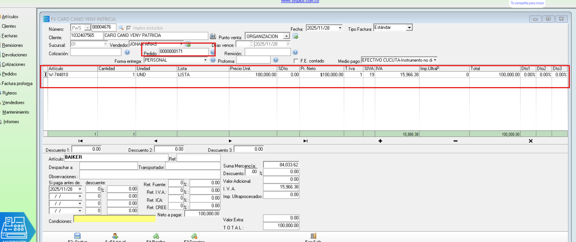 AL LLAMAR EL PEDIDO EN LA FACTURA, NO TRAE LOS ITEMS A FACTURAR