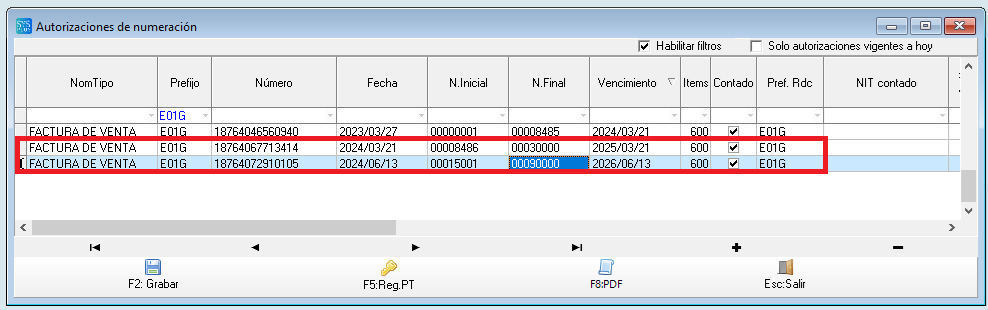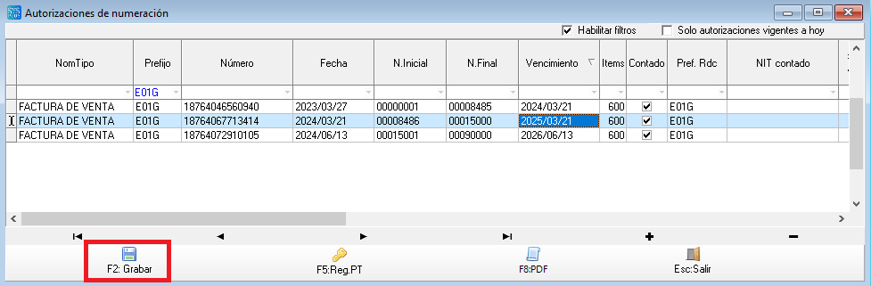 Si tiene varios prefijos, puede usar la opción de "Habilitar filtros", que esta ubicada en la parte superior de ventana de "Autorizaciones de numeración", al habilitar este campo, el sistema abre un nuevo registro donde usted puede ingresar el prefijo manualmente, para que el sistema aplique el filtro, debe oprimir la tecla "Enter"