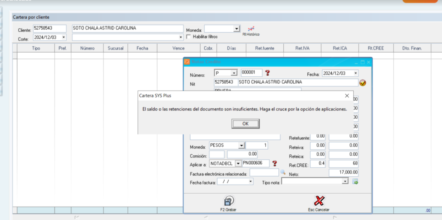 SYSplus: Al intentar realizar una nota crédito de clientes el sistema arroja mensaje de saldo o retenciones son insuficientes