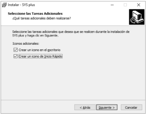 En la siguiente pantalla seleccione el nombre del grupo en la menú de inicio de Windows donde aparecerá el programa, de forma predeterminada se sugiere "SYSplus" y por último seleccione si desea crear un acceso directo desde el escritorio y desde el menú de inicio de Windows y por último presione el botón instalar: