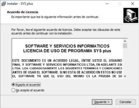 Ubique la carpeta o unidad que contiene el instalador, usalmente llamado setup_SYSplus2023.exe en donde 2023 corresponde a la versión del programa adquirido. Y ejecútelo haciendo doble clic sobre el mismo, si aparece una pregunta de confirmación, aceptela. Cuando aparezca el acuerdo de licencia debe selecionar la opción "Aceptar el acuerdo" y continuar.