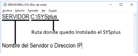 Como está instalando una terminal, es necesario indicarle al programa dónde se encuentra el servidor, por lo general se tata del nombre de un equipo en su red local (o su dirección IP), seguido de la carpeta dentro de ese equipo, donde se instaló el programa. Consulte con su administrador de red o proveedor de servicios de telecomunicaciones sobre la disponibilidad de dicha ubicación. Una vez conocida la dirección IP o nombre del equipo usted debe proceder a modificar el archivo de conexiones de SYSplus, para esto ubique el archivo SERVIDORES.CFG en la carpeta de instalación del programa y ábralo con cualquier editor de texto plano que desee, por ejemplo puede usar el programa Bloc de notas (Notepad), que viene incluido con Windows (puede usar el botón derecho del Mouse estando sobre el archivo y seleccionar la opción abrir con y luego seleccionar de la lista el programa Bloc de notas)