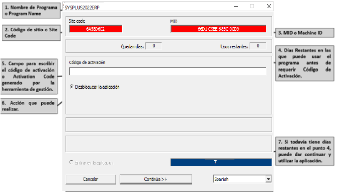 Para efectos del control de la legalidad del software SYSplus incorpora un mecanismo de protección que asocia su licencia al equipo y a la carpeta específica en que se instaló inicialmente el programa mediante la verificación de números de serie de la CPU y del sistema operativo de forma que dichos parámetros se verifican cada vez que se ingresa al programa y si se detecta un cambio en los mismos se pedirá una clave de activación que deberá realizarse de acuerdo a las políticas de activaciones en la página de activaciones creada para cada usuario de manera independiente y a la cual podrá tener acceso con el usuario y contraseña entregados al momento de adquirir el producto junto con la licencia. , es por esto que la primera vez que ingresa al programa se mostrara una ventana solicitando dicha activación.