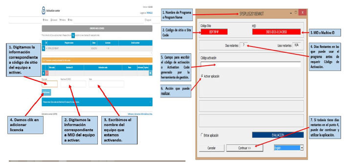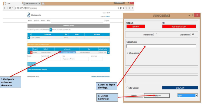 8. Presione el botón adicionar para generar el código de activación, el cual debe ingresar en la casilla "Código de activación" de la ventana de activación de SYSplus y presionar Continuar. Puede copiarlo y pegarlo para garantizar que sea idéntico ya que cualquier diferencia, incluso si se agrega un espacio, se detectará como un código incorrecto. Es importante que no tenga abierto el programa al hacer este proceso, en especial si está activando un servidor con varios usuarios de escritorio remoto, es importante asegurarse que ninguno de los usuarios remotos tiene abierto el programa, de lo contrario es posible que a dichos usuarios no les tome la activación y tendrá que repetir todo el proceso