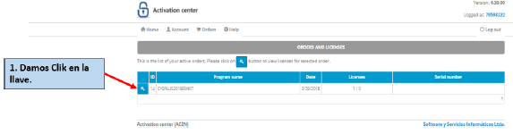 5. Seleccione la licencia a activar (servidor o terminal) y presione el botón con el icono de la llave
