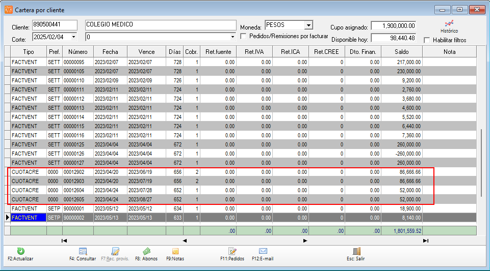 Si se quiere personalizar el monto y fecha de las cuotas se pueden ajustar, siempre que la suma de las cuotas corresponda con el saldo pendiente de la factura y luego grabar el documento. En ese momento se cancela la factura con un tipo de abono llamado CREDITO CARTERA (tipo interno 48), por lo que dicha facturaya no va a aparecer en cartera y se van a crear nuevos documentos con tipo CUOTA CREDITO (código interno 49), estos nuevos documentos se podrán abonar mediante recibos de caja, cruces con egresos o aplicaciones de créditos en el momento que se haga el abono correspondiente