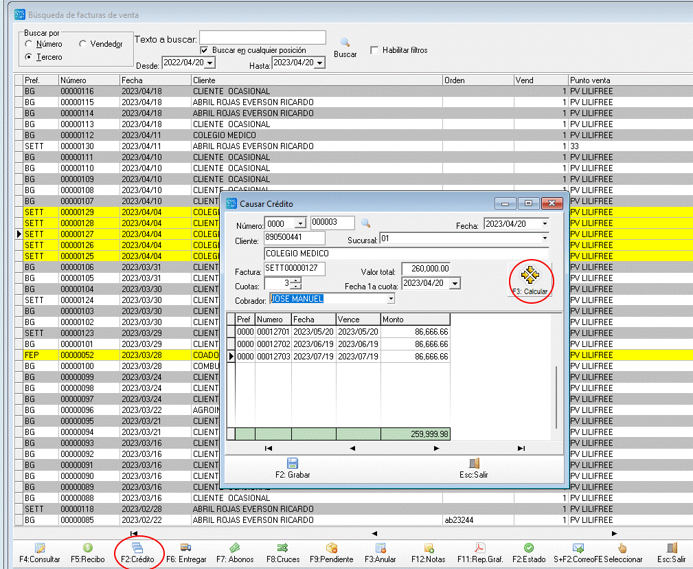Para ello una evz grabada la factura puede buscarla y usar el botón F2:Crédito, con lo que se abre una ventana sobre la que se podrá digitar el número de cuotas y la fecha de la primera cuota a pagar. Si sobre esta ventana se presiona el botón Calcular, se dividirá el monto pendiente entre el número de cuotas indicado.