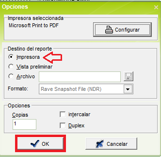 - Después de seleccionada la impresora, se puede dar clic en la opción de imprimir y "ok"