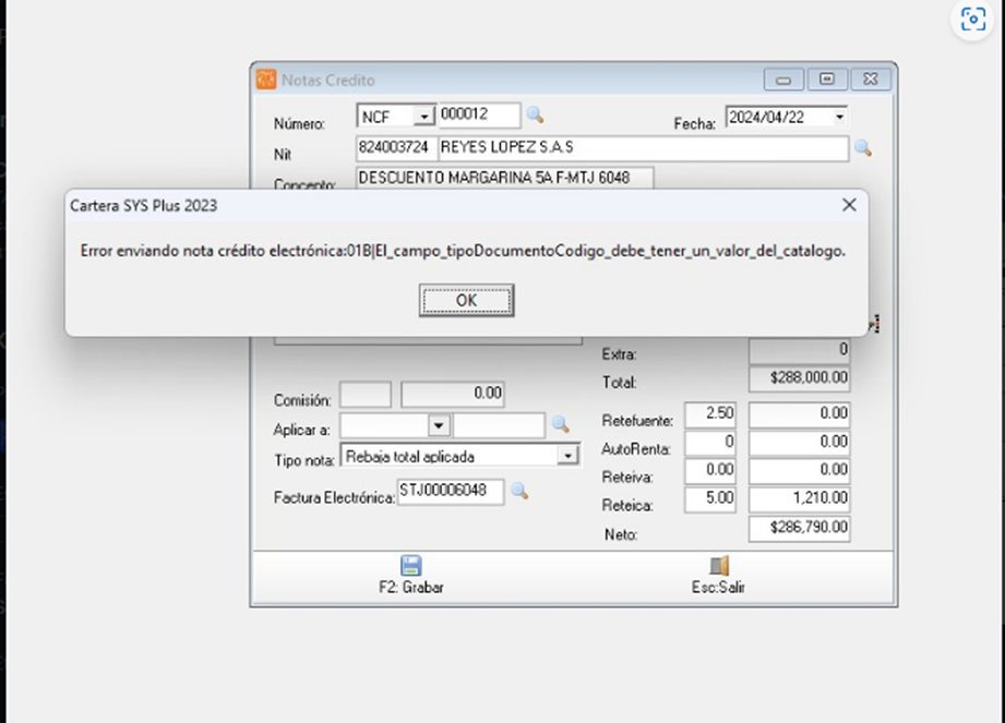 SYSplus COMPRAS: AL ENVIAR DEVOLUCIÓN, O DESCUENTO DE DOCUMENTO SOPORTE NO GENERA CUFE NI LOG PROVEEDOR HKA