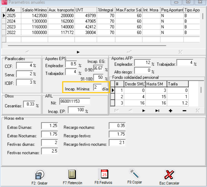 Solución: El sistema valida que en la tabla de parámetros anuales esté configurado el número mínimo de días requerido para registrar una incapacidad general. Para solucionar el problema, se debe verificar y, en caso necesario, actualizar dicho parámetro en la base de datos.
