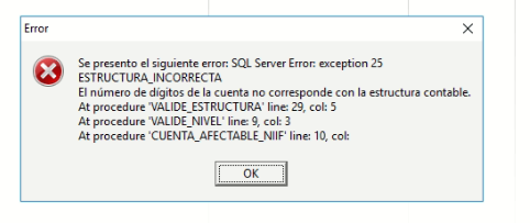 Estructura incorrecta , El numero de dígitos de la cuenta no corresponde con la estructura contable
