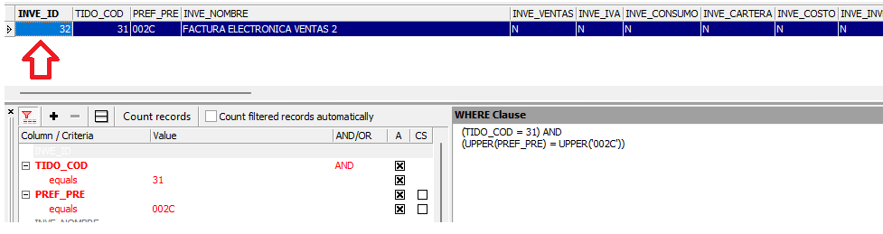 b. IDINTER (Id de la interfaz: Este se encuentra en la tabla INTERFAZ_VENTAS en el campo INVE_ID, filtrando el campo TIDO_COD con el numero 31 (que es el numero de documento interno para las facturas de venta) y el campo PREF_PRE indicando el prefijo que quiere buscar, para el ejemplo '002C'.