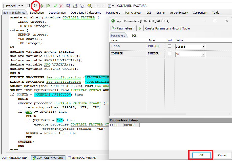 para esto, se debe ejecutar el IBEXPERT y se debe a correr el procedimiento CONTABIL_FACTURA, el procedimiento pregunta dos parametros: