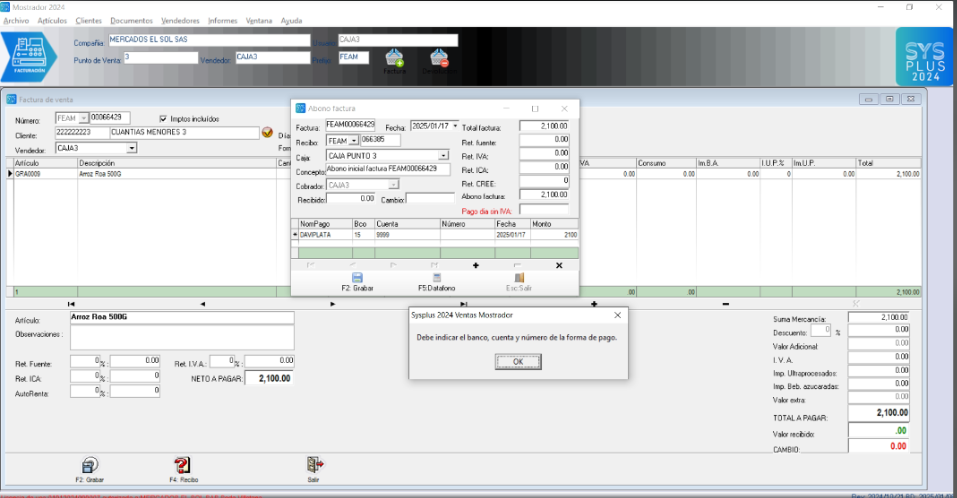 SYSplus Mostrador: Debe indicar el banco, cuenta y numero de la forma de pago