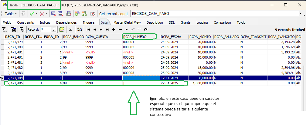 Se debe ingresar a la base de datos y buscar en la tabla recibos_caja_pago en la columna RCPA_NUMERO y tratar de buscar esa forma de pago si hay un número con letras, espacios o algún carácter distinto de números y modificarlo por el consecutivo que actualmente se encuentra