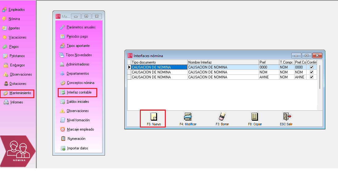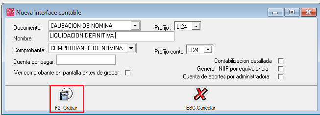 Modulo de nomina / Mantenimiento /Interfaz Contable / F5 Nuevo