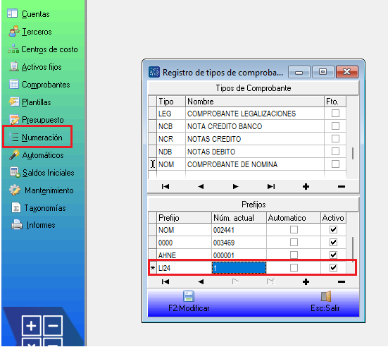 Modulo Contabilidad / numeración / buscar el tipo de comprobante correspondiente / Indicar prefijo y numero (el numero NO debe ir marcado con el check de automático)
