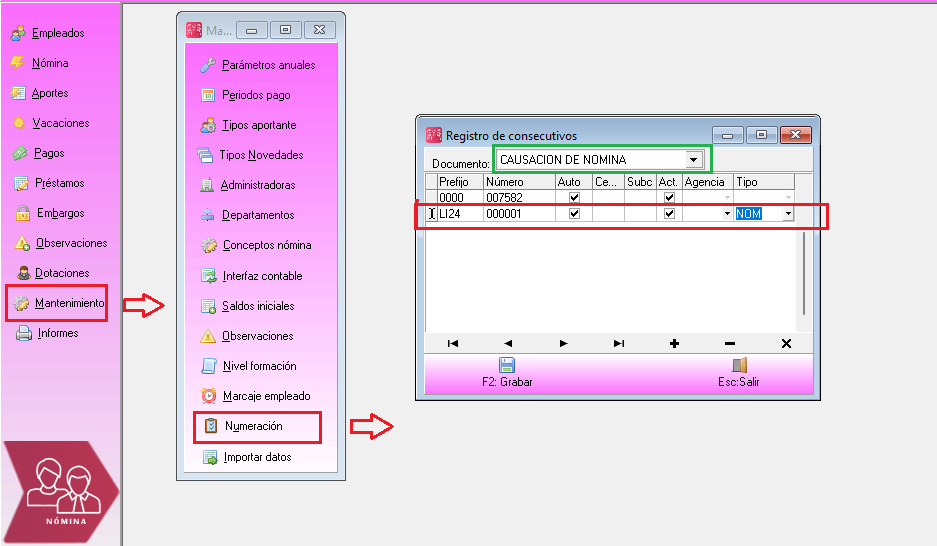 Modulo de nomina / Mantenimiento / Numeración / CAUSACION DE NOMINA / Nomina