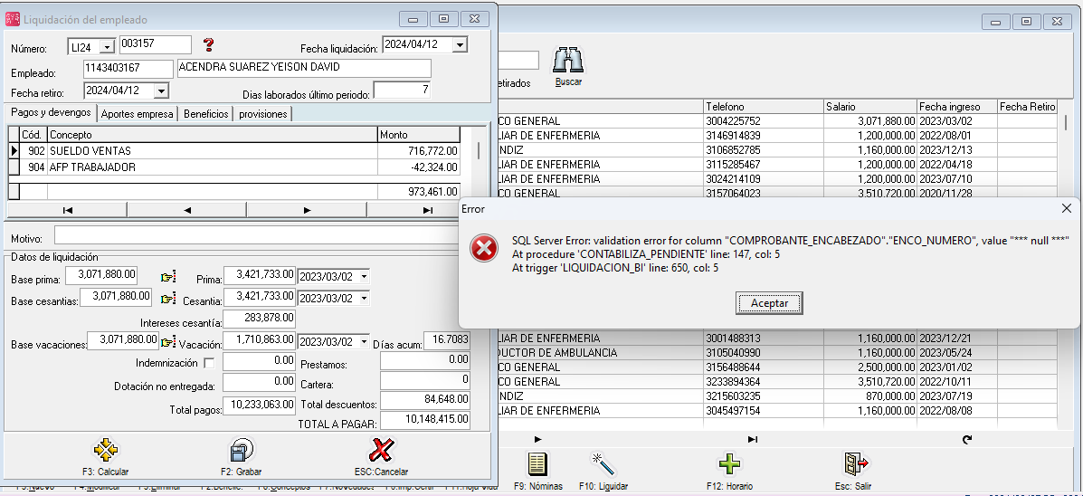 Opción: El error puede darse para la liquidación definitiva de los empleados o en el registro de vacaciones.