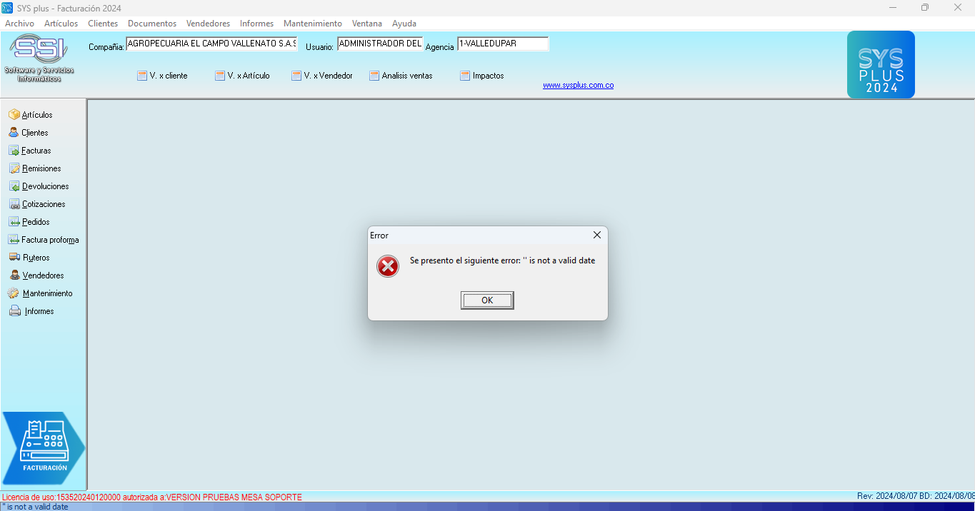 SYSplus: ''is not a valid date'' al ingresar a la opción de facturas del módulo de facturación