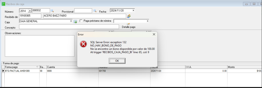 AL REGISTRAR UN RECIBO DE CAJA GENERA EL MENSAJE NO HAY BONO DE PAGO