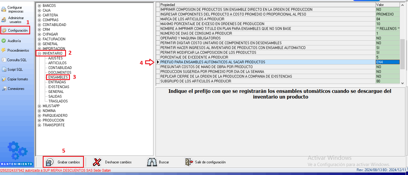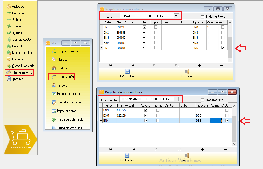 Automático: Si esta marcada la casilla el sistema asignará el consecutivo automáticamente y el usuario no podrá modificar. Si la casilla está inactiva, quiere decir que el usuario puede cambiar el número que aparece en la ventana, asegurándose que no se repita con uno ya previamente guardado. Se recomienda dejar automática la numeración del documento de ensamble si lo maneja automático.