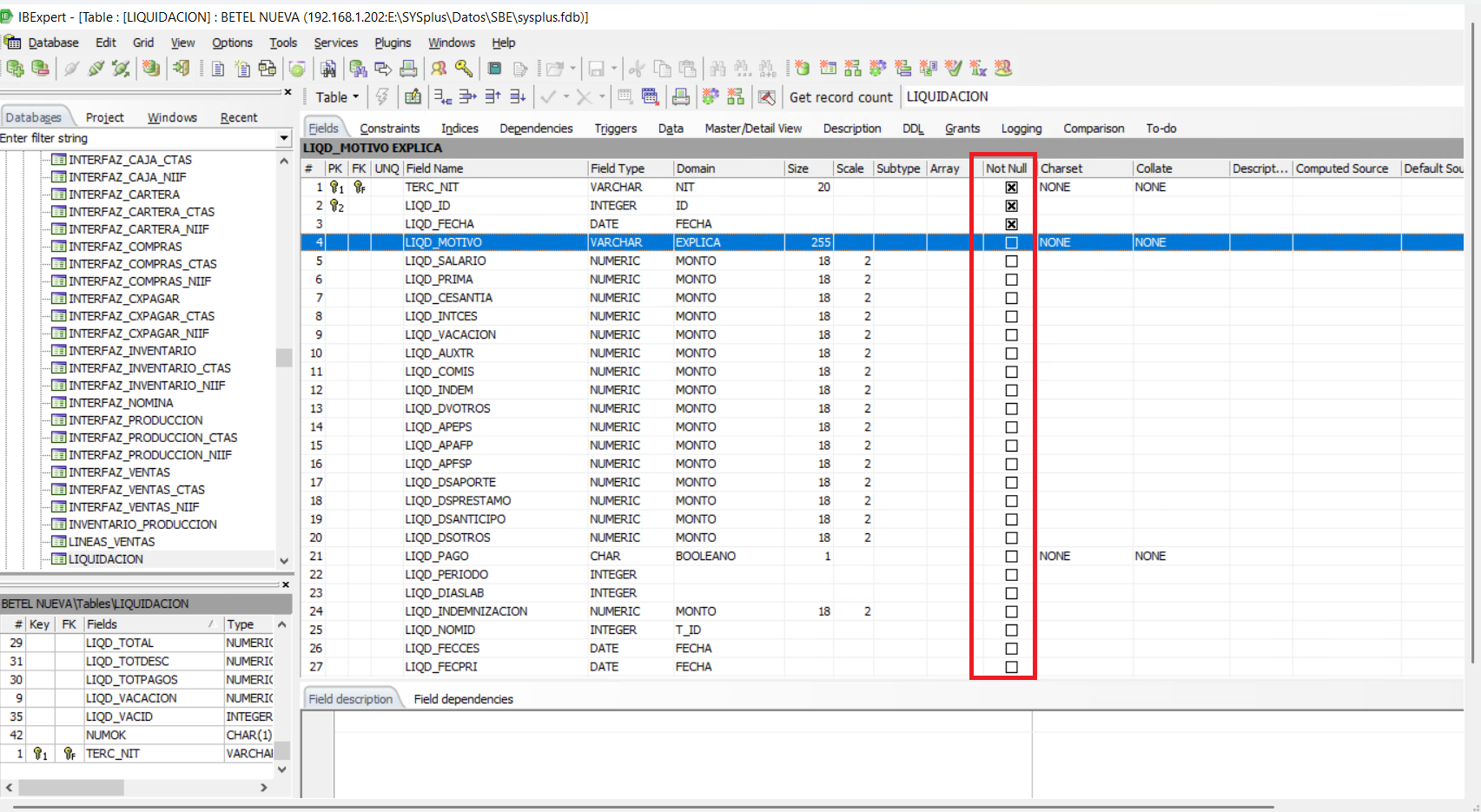 Se debe ingresar a la tabla por Ibexpert, en este caso la de LIQUIDACION ey dirigirse a la ventana de Fields (campos)