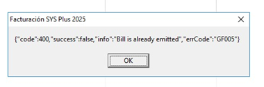 Mensaje enviando documento electronico SYSplus Bill is already emited