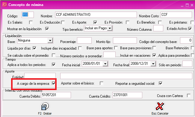 Recordemos que los conceptos que deben estar con el check activo de "A cargo de la empresa", son: