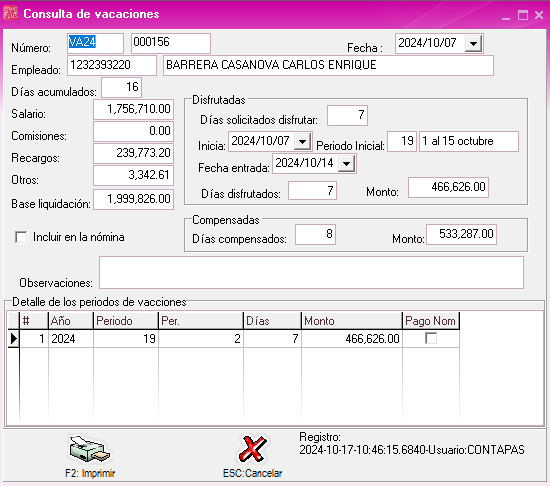 Respuesta: Los conceptos que estan marcados como a cargo de la empresa, no se calculan dentro del periodo de vacaciones, sino en la liquidación general de nomina, ya sea quincenal o mensual.