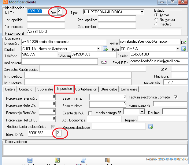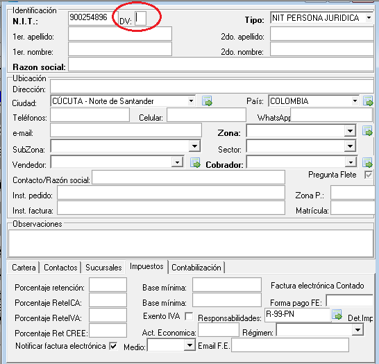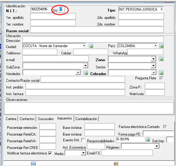 Para los terceros ya creados, se debe corregir manualmente el campo de DV Tanto en la sección de "Identificación", como en la pestaña de "Impuestos " - Identificación DIAN