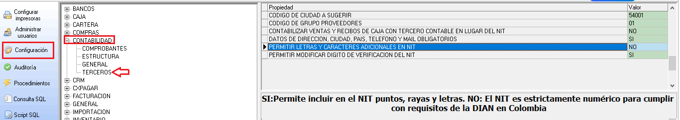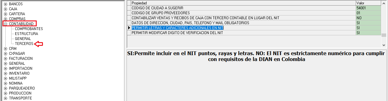 CONTABILIDAD / TERCEROS / PERMITIR LETRAS Y CARACTERES ADICIONALES EN NIT / SI