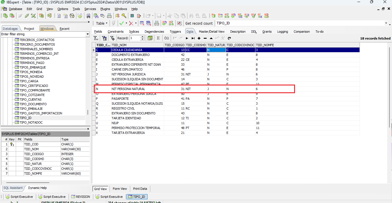 - Por BD, en la tabla de TIPO_ID, se cambio el tipo de ID de la opcion de NIT PERSONA JURIDICA, dejando el campo TIID_NATUR en J de jurídico y TIID_NOMFE en 6, como lo muestran las imagines.