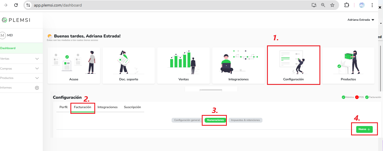 4. Se ingresa al cliente y luego se dirige a Configuración / facturación / numeración / nueva
