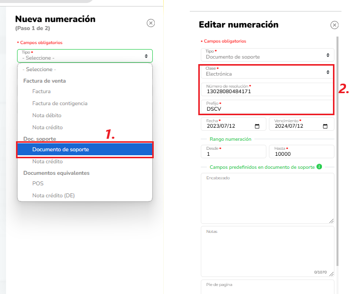 5. En nuevo, se ingresa a tipo y selecciona Documento Soporte / en Clase se selecciona Electronica / en Numero resolucion, se ingresa el brindado por la DIAN / en Prefijo se ingresa el solicitado / si ya se encuentra vinculada en la DIAN los campos de Fecha, Vencimiento y rango d enumeracion, se diligenciaran automáticamente, como se muestra en la imagen. Si esto no sucede es porque la autorización no esta asociada al proveedor tecnológico en la pagina de la DIAN.