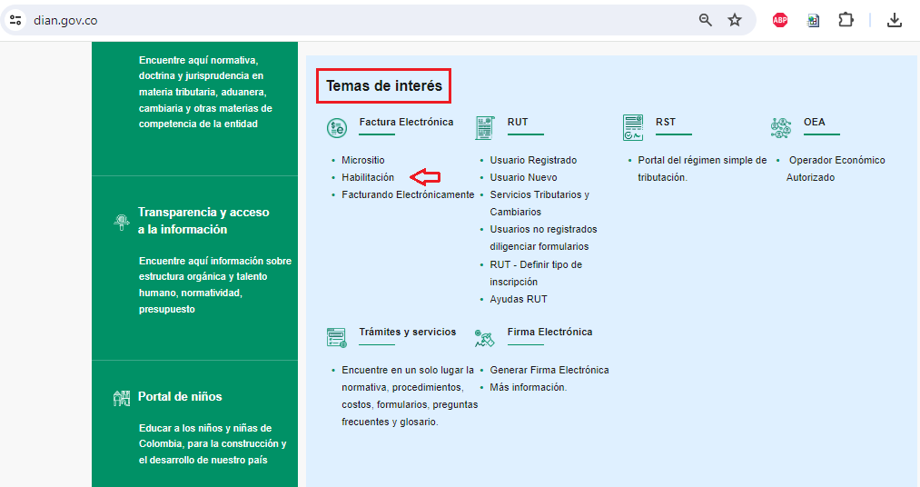 ngresar a la página de la DIAN www.dian.gov.co en la parte inferior en los TEMAS DE INTERES, dar click sobre la opción "habilitación"