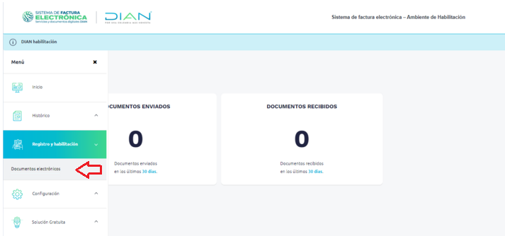 4. Una vez llega el correo con el link, se tiene un rango máximo de 60 minutos para poder acceder a la página. Al ingresar se vamos a ir a la opción de "Registro y habilitación" - "Documentos electrónicos"