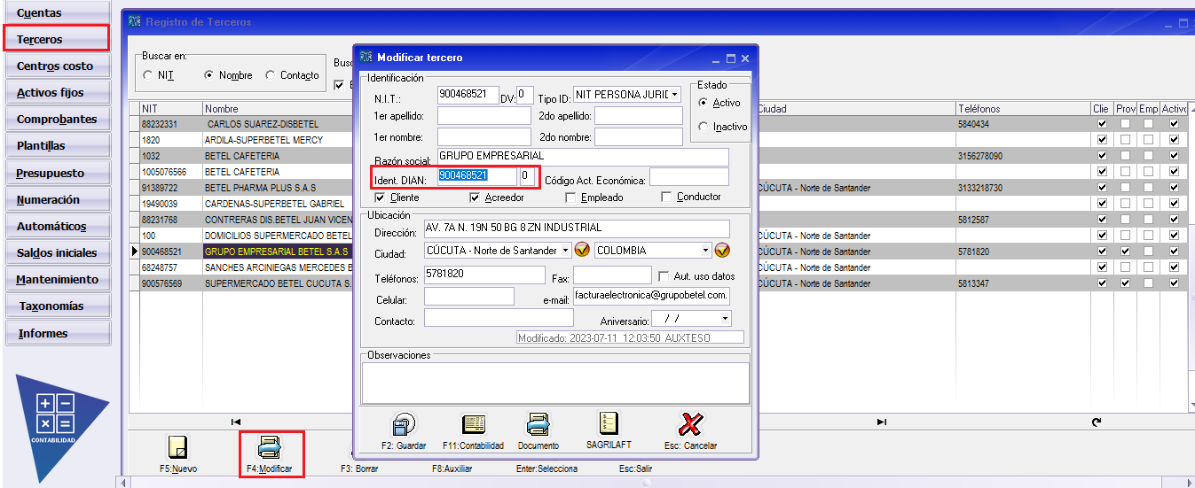 Solución: Se debe acceder por el modulo de Contabilidad o modulo de Tesorería la ventana "Registro de Terceros" en la parte de Datos de Identificación DIAN, en el campo de DV DIAN se debe agregar o corregir el digito de verificación, si no esta seguro de cual es, puede validarlo en el siguiente link