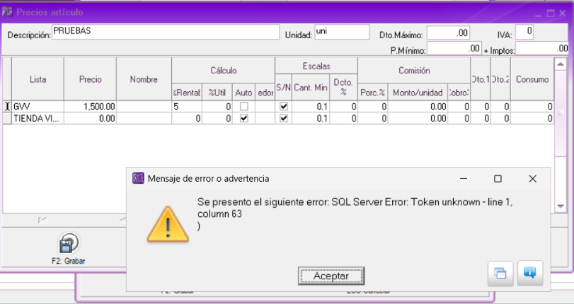 Error: Al crear un articulo y agregarle el porcentaje de rentabilidad o utilidad genera mensaje: Token unknown -line1, column 73 )