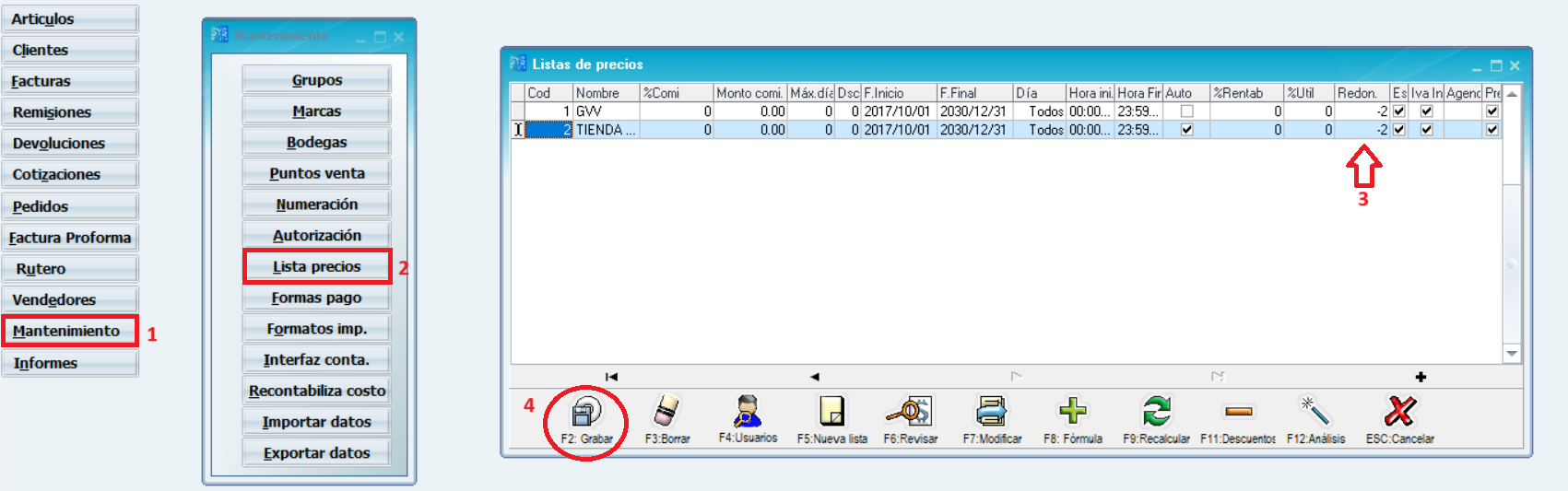 1.Para configurar la lista de precios, se debe realizar desde el modulo de facturación, opción de Mantenimiento / Lista de precios / Redon