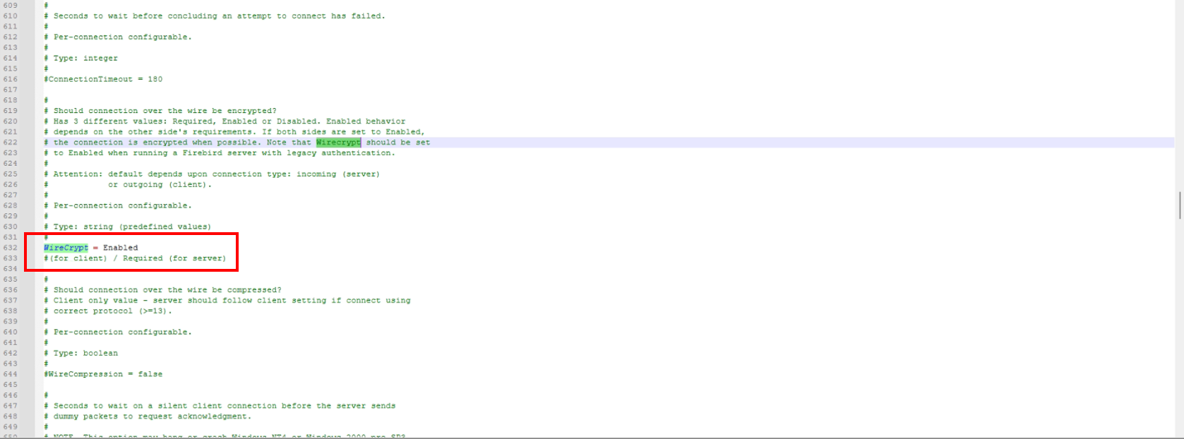 2. Diagnostico: Hacer el siguiente cambio en el archivo firebird.conf que se encuentra dentro de la carpeta de firebird_3_0: Wirecrypt = Enabled;