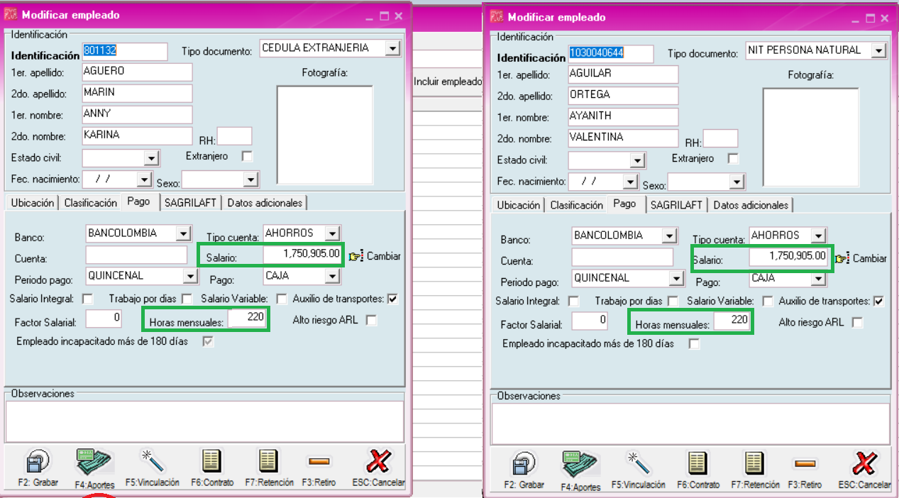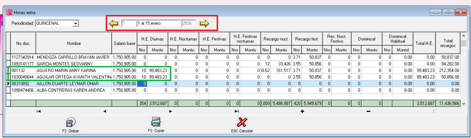 Al modificar los dos empleados, con el mismo numero de Horas Mensuales el sistema calcula igual el valor de Horas extras / recargos y/o dominicales.