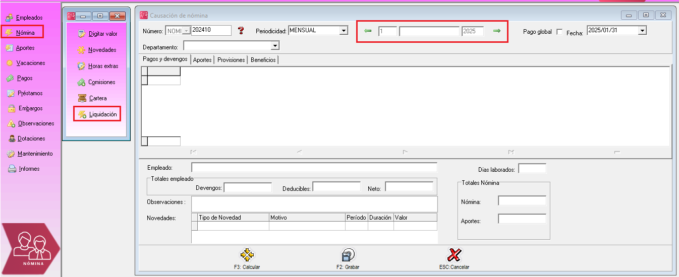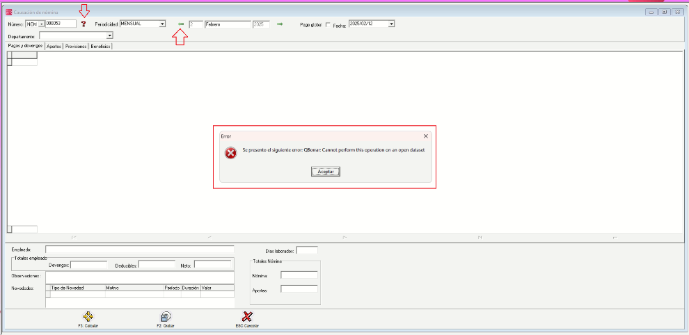 Diagnóstico: En la opción de Periodos de pago" no esta el mes o periodo que se va a causar. Es necesario crearlo.