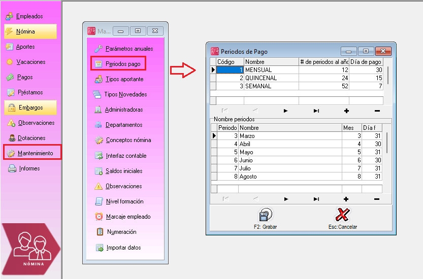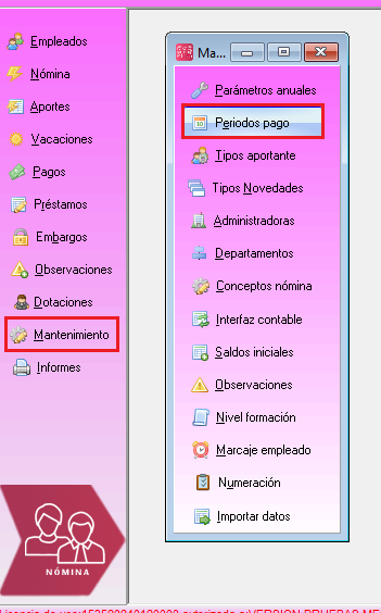 1. Inicialmente se debe revisar los periodos de pago, esto se puede realizar ingresando en el modulo de nomina a la opción de Mantenimiento, al desplegarse las opciones , debe seleccionar "Períodos de pago".