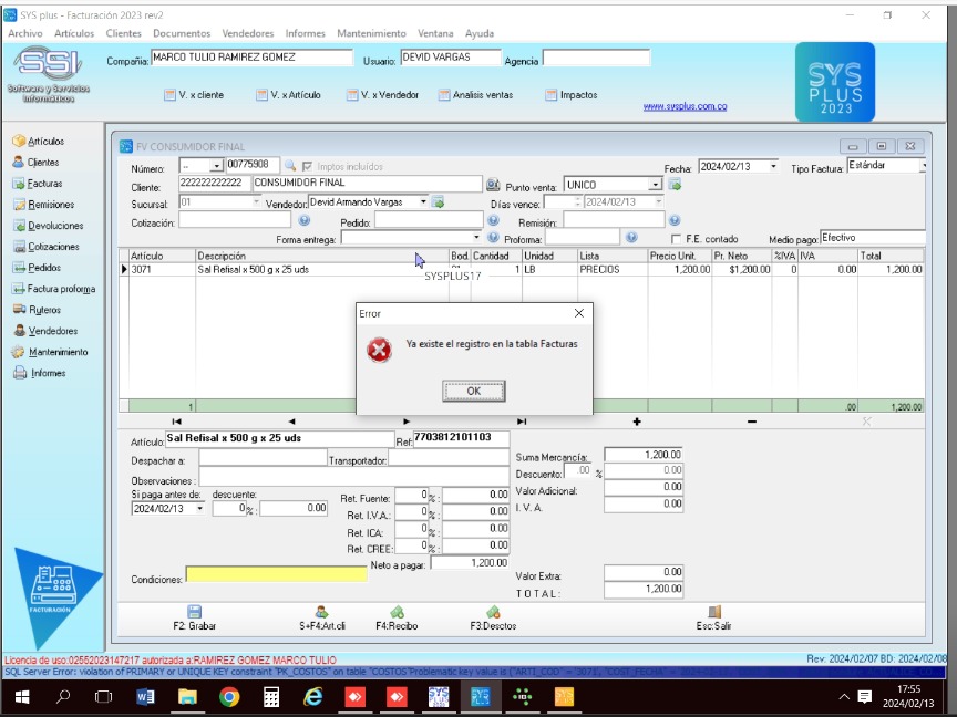 SYSPlus:"Ya existe el registro en la tabla facturas"