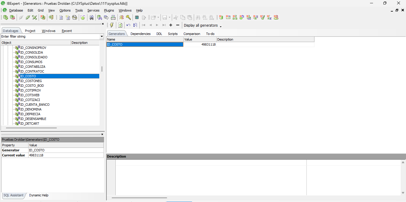 Este mensaje (imagen1) aparece cuando se realizó una actualización de base de datos el mismo día que han realizado facturas "en el ejemplo el cliente realizo facturas todo el día y la actualización fue a las 4:00pm del mismo día", este aparece porque al realizar movimientos con este artículo se cambia los costos y se crean registros iniciando en 1 en los "generators" y el generador "ID_COSTO" (Imagen 2) y van cambiando según el movimiento de artículos, cuando se hace la actualización este campo se vuelve a reiniciar por lo que vuelve a tomar valores que ya han sido utilizados anteriormente y no permite realizar movimientos con los artículos, por lo que se recomienda cambiar este valor a 400 para que pueda tener un margen de busqueda de coincidencias de mas amplio.